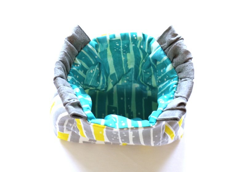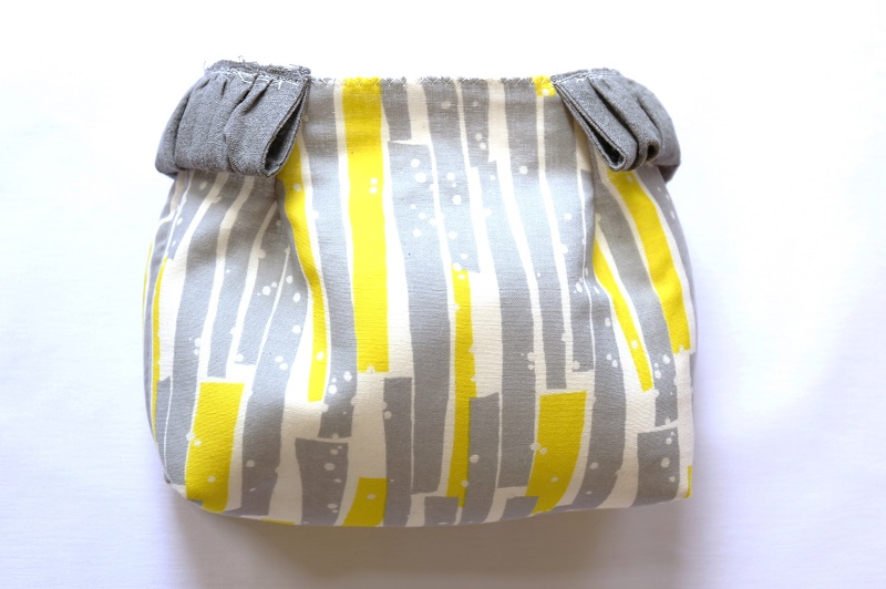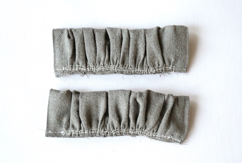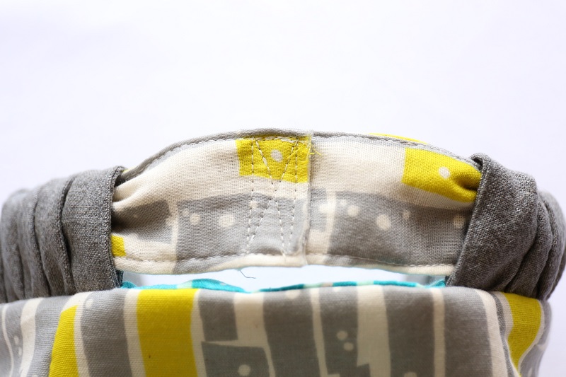 ギャザー部分を本体と合わせるときは、布がだいぶ重なるので、ゆっくり縫い進めてください。今回は、グレー無地のリネンを使いましたが、共布のガーゼで作っても可愛いと思います。