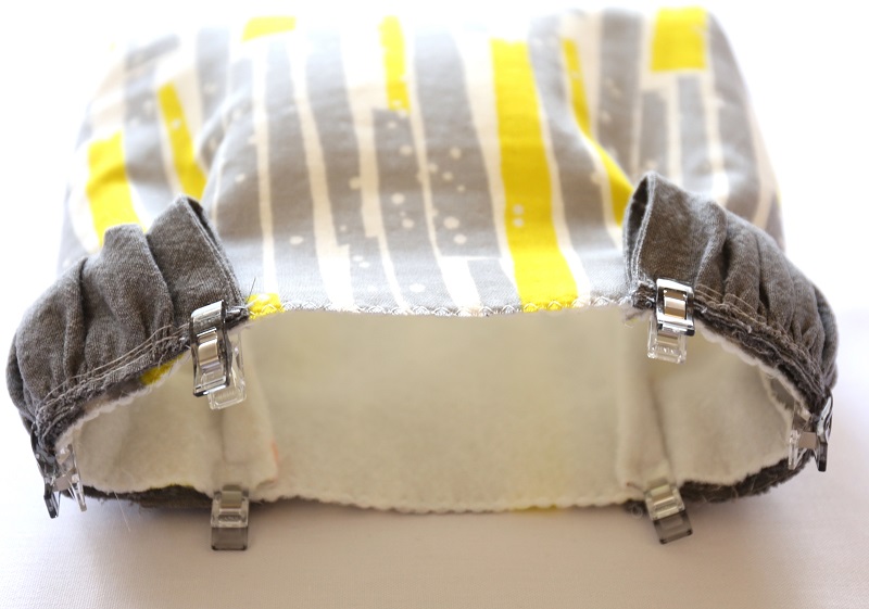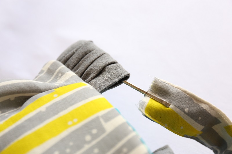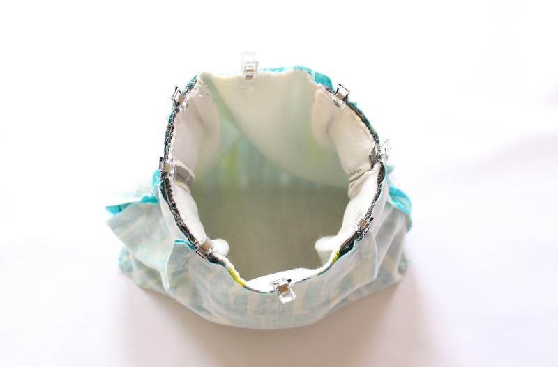 中表になるように裏袋を重ねて、口辺をぐるりと縫います。