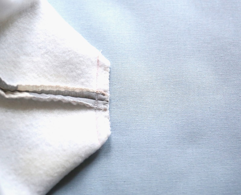 本体表布にキルト芯を重ね、布端に縁かがりミシンでかけます。