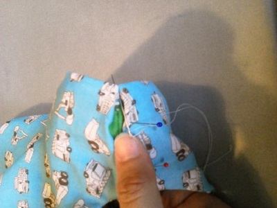 今回の作品は、男の子用のリバーシブルベストです。ダンブカーやクレーンなど、男の子の大好きな働く車がいっぱいの布で作りました。制作してくれたのは、「いちにのさん」というブランドネームで作品づくりをしている新倉弘美さんです。