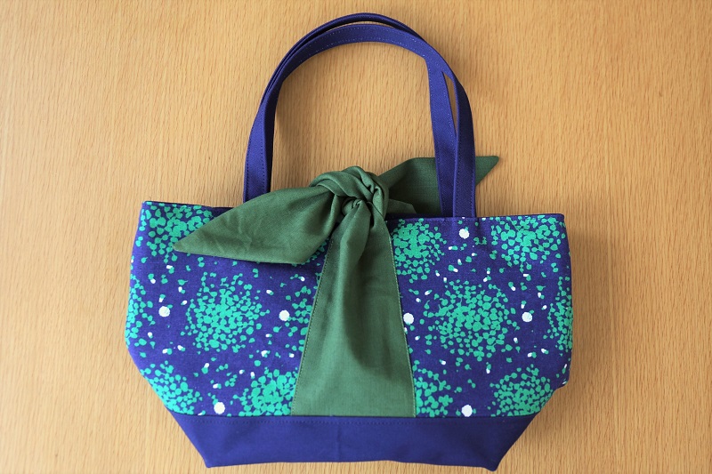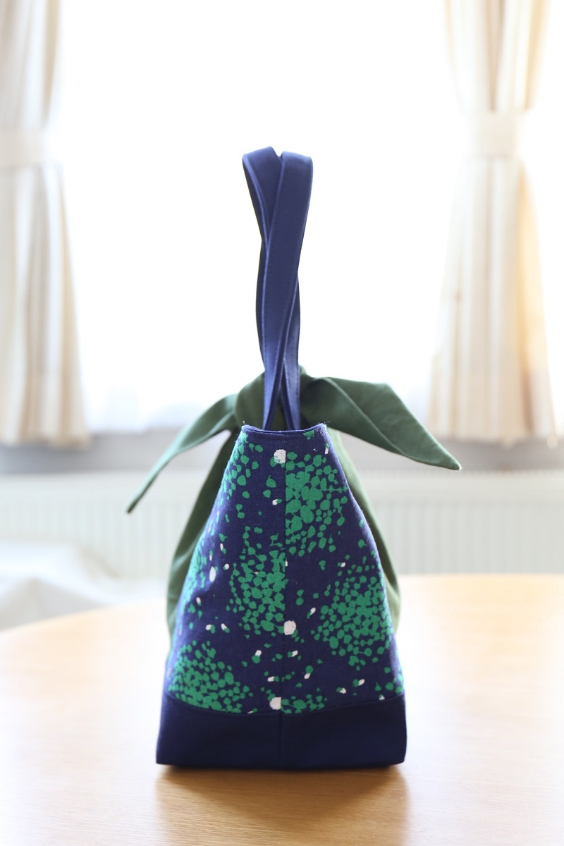 地色のネイビーと、柄部分のグリーンのコントラストが美しくて、カッコいい印象です。大きめの柄だし、しっかりめの生地なのでバッグにピッタリだと思いました。