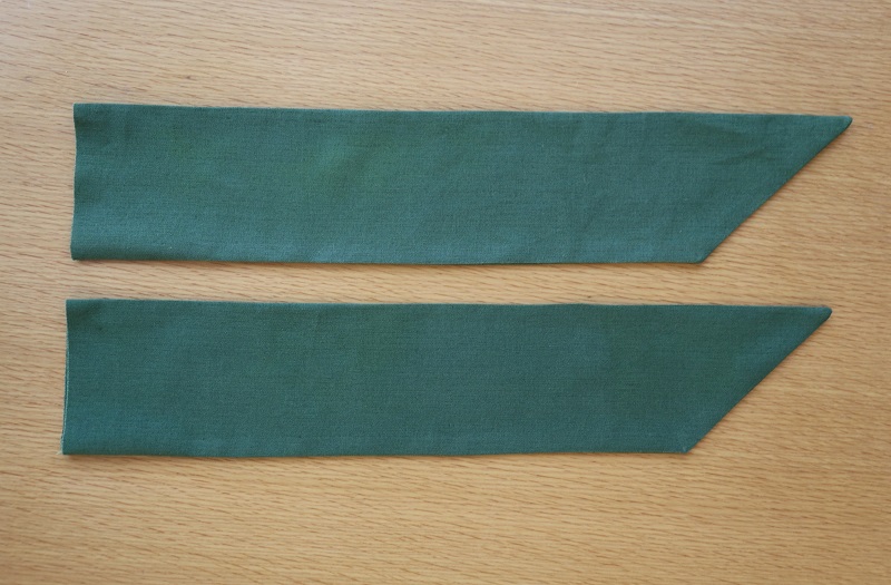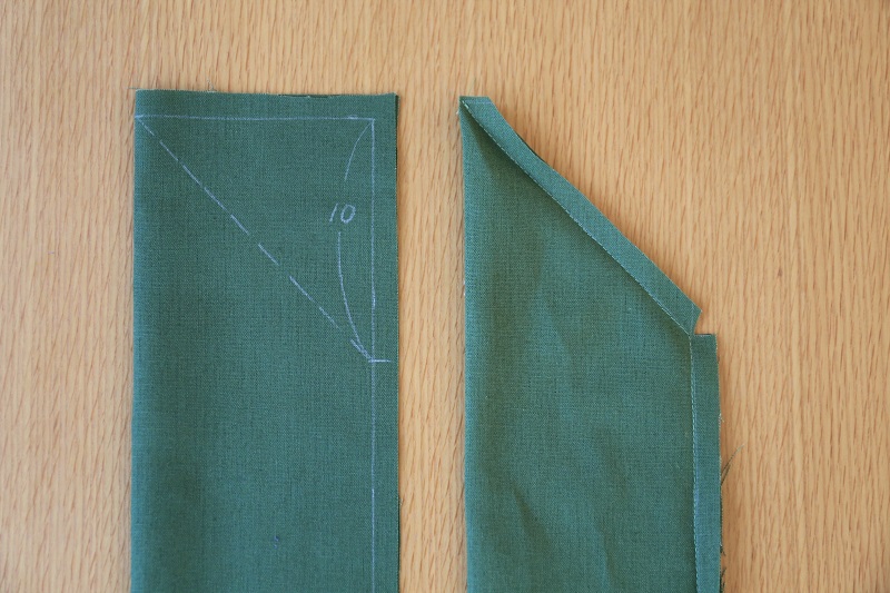 リボン布を中表に二つ折りにして、1cmの縫い代をとり、角から10cmの位置にななめの線を入れてカットします。