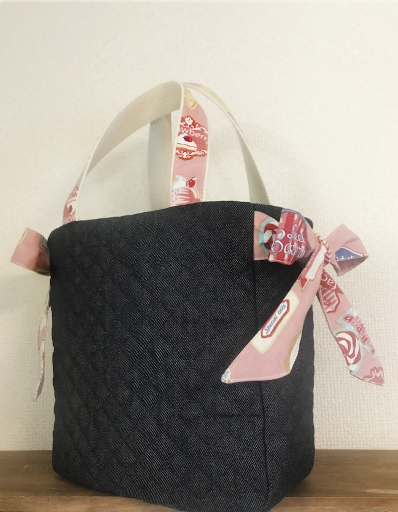 ドーナツやケーキなどのスイーツが並んだキュートプリント、「Retoro pop」シリーズを使ったバッグです。表布はあえてデニムでシンプルに、内側をRetro popのプリントに。使うたびに美味しそうなスイーツが顔をのぞかせ、気分が上がりますよ!