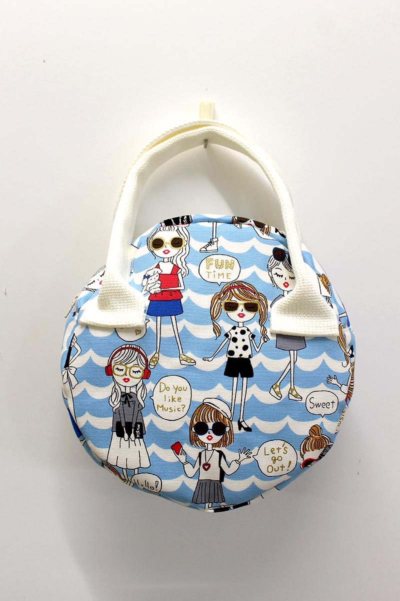 まあるいフォルムと白い持ち手がスタイリッシュな丸型トートバッグです。スマホやお財布など、お出かけのマストアイテムがすっぽり入る大きさは、普段づかいにぴったり。おしゃれな女の子が並んだ楽しげなプリントは「Kira Kira Girls」シリーズ、コットン100%のオックスフォードです。