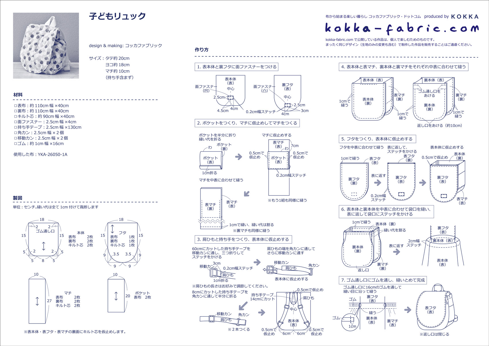 ランドセル型のふた付き子どもリュックです。両脇に外ポケットが付いているので、ペットボトルや折り畳み傘などが入れられます。使った布は「金平糖」シリーズ。優しい色合いの金平糖がちりばめられた総柄です。コットン100%のシーチングは縫いやすく、バッグや小物づくりに向いています。