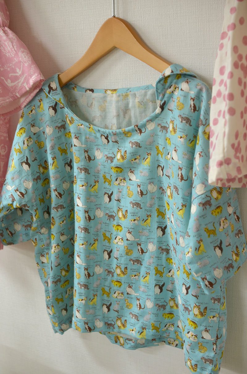 セーラー服のような襟が可愛いいキッズブラウスをご紹介。いろんなネコちゃんがちりばめられた楽しげな柄は、トレフルキッズシリーズのダブルガーゼです。
