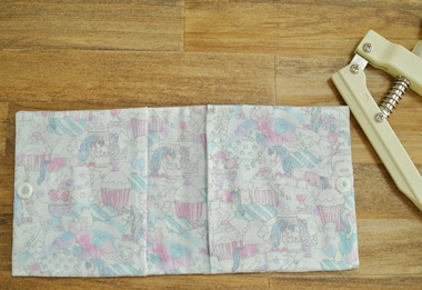 内側のポケット面にプラスナップをつけます。 ※外側も一緒に挟むと中に物が入らなくなるので注意!
