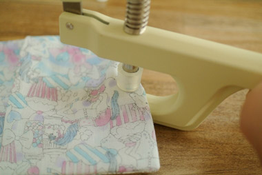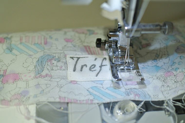 今回は生地の耳に印刷されている生地名をタグとして使用しましたが、お名前シール等をはってもいいですね。 私はプラスナップを使いましたが、手縫いのスナップボタンでもOKです。