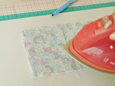 ダブルガーゼは縮みやすいので、縦横1cmほど大きめに裁断し、軽く水にくぐらせて干し、半乾きの状態でアイロンをかけて寸法通りに裁断します。