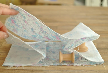 端の4か所をななめにカットしておくと、返した時にキレイに仕上がります。 ※縫い糸を切らないように注意!