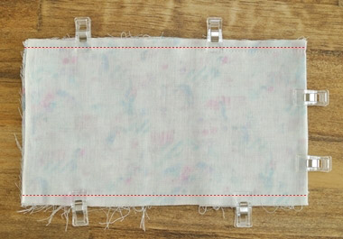 小物を縫う時はクリップがおすすめ ♪ 数か所クリップでとめて画像の上下の点線部分(端から0.7cmぐらい)を縫います。 ※左側に返し口がきます。