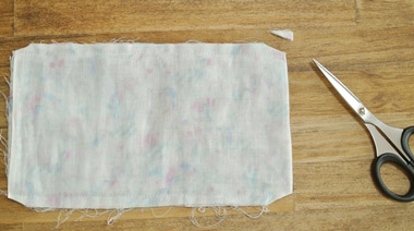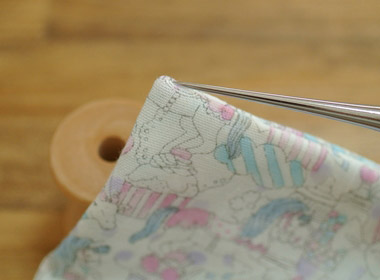 端の部分は、目打ち等でそーっと角を出します。 ※ガーゼ生地は糸がほつれやすいので、やさしくそーっと。