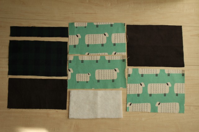 パーツが多いので布合わせで悩みそうですが、私は中布も含めて3種類の布に絞りました。ファスナーポケットを開けると羊が見えるように、中布(右下)も羊布にしています。フラップ部分には接着キルト芯(中央下)を貼ります。