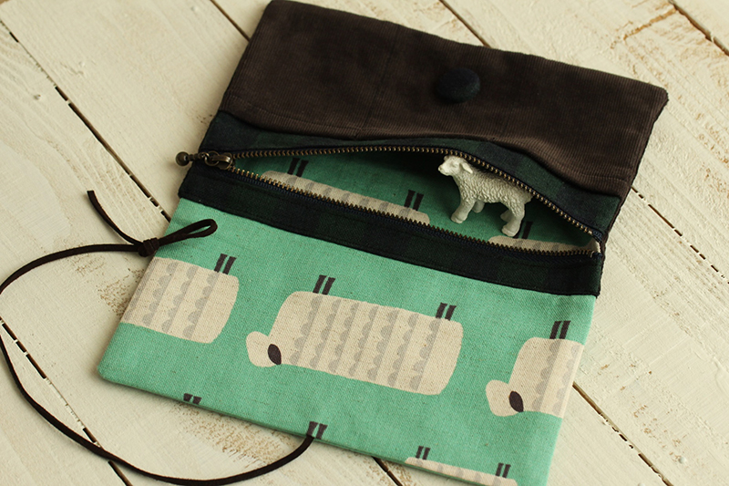 大小の羊が可愛く並んだ柄は、エレン・ベイカーさんの新柄。作ってくれたのは、中山佳苗さん。「通帳入れにもぴったり!」という使い勝手もよさそうなポーチを考えてくれました。