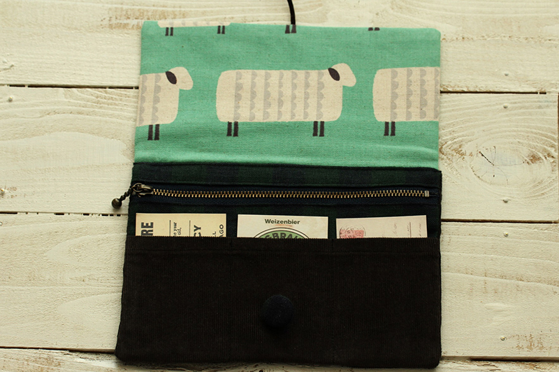 カードが入る三連のポケットとファスナーポケットを付けました。ボタンは共布でくるみボタンを作りました。あれこれいろんな布を使うより、ある程度絞った方がまとまりがあるように思います。