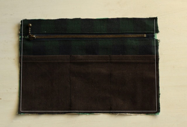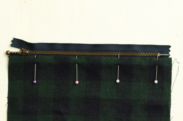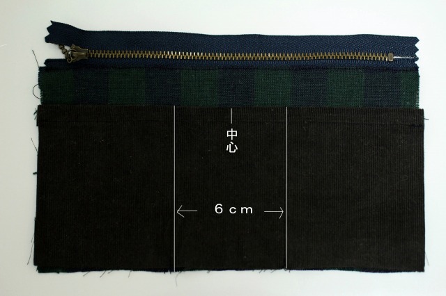 ポケットの内布になる羊柄の布の上に(5)を乗せてその上にファスナーの上部分(4cmのブラックウォッチの端を1cm折ってアイロンを掛けたもの)を乗せます。