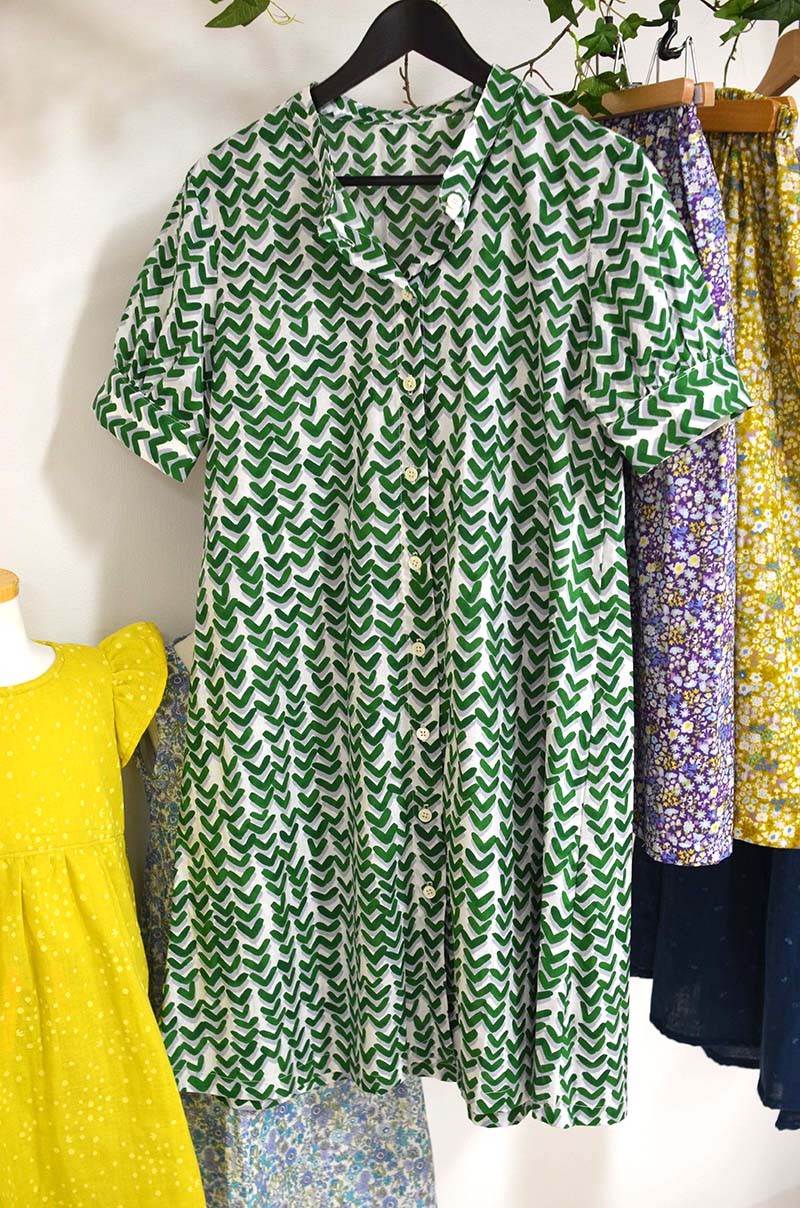 小さなスタンドカラーがついた半袖ワンピースです。デニムのパンツなどと合わせてデイリーに着回せます。前のボタンをはずしてさっとはおれる1枚としても重宝しそう。V字模様のストライプはすっきりほっそり見える効果も♩ 使った布はトレフルクチートのローンです。