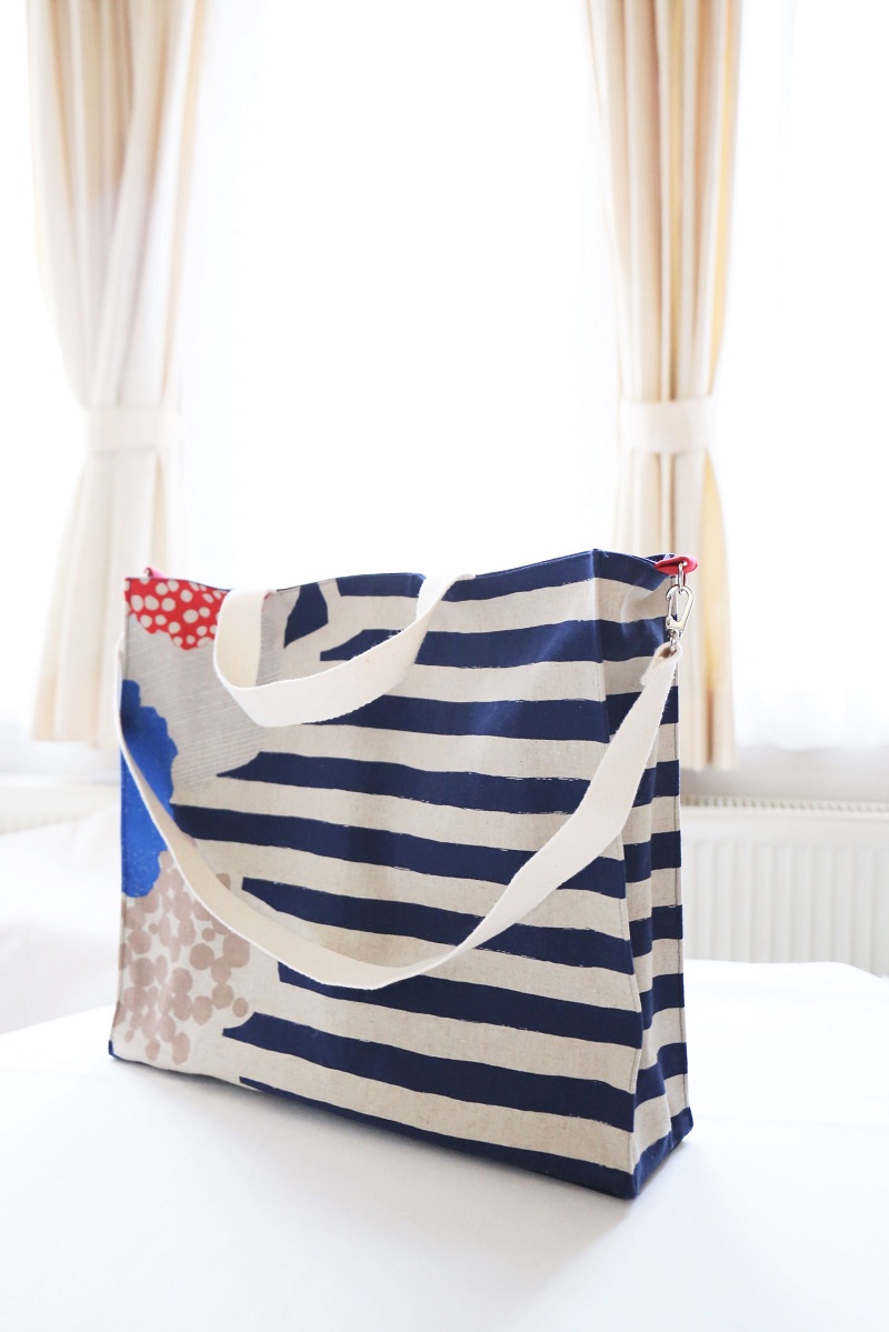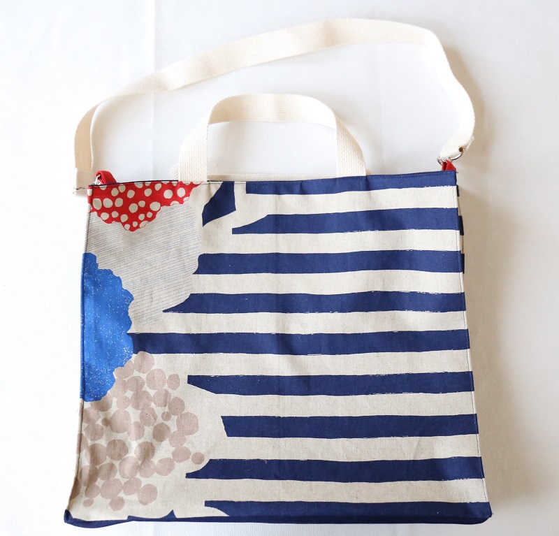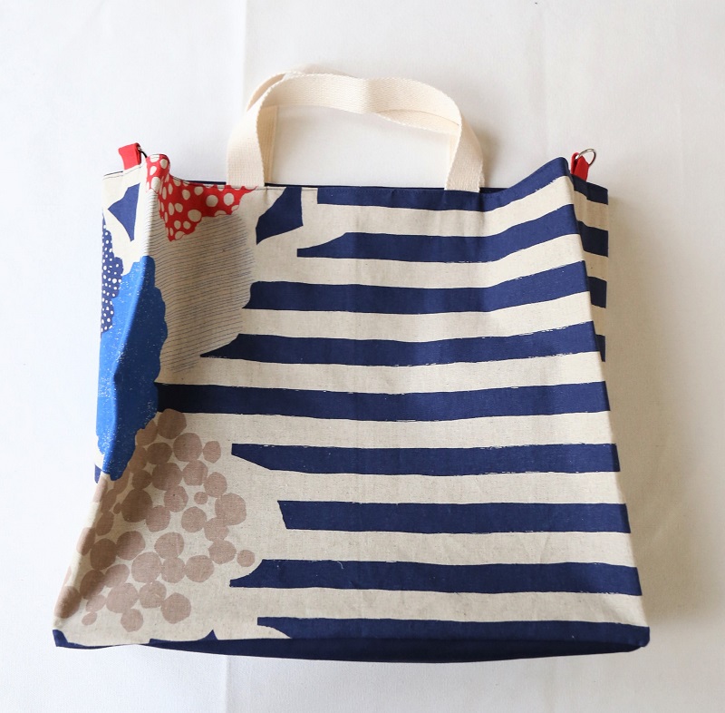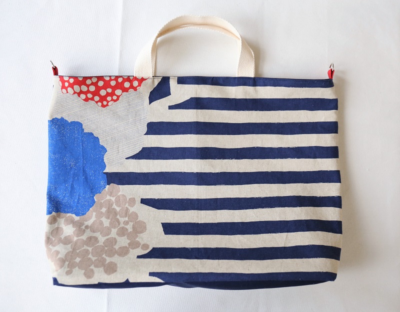 バランスよく花とボーダーが見える、ちょうど良い幅になるよう仕立てました。柄のキリッとした感じを活かしたくて、かっちりした紙袋風になるように、角に入れたコバステッチがポイントです。大きなバッグなので、重たくなっても持ちやすいように、取り外し可のショルダーもセットしました。