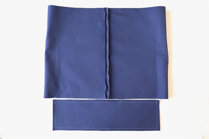 脇の縫い代を割り、中央にずらします。底布に縫い線と中央の印を書き入れます。