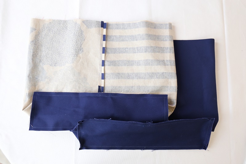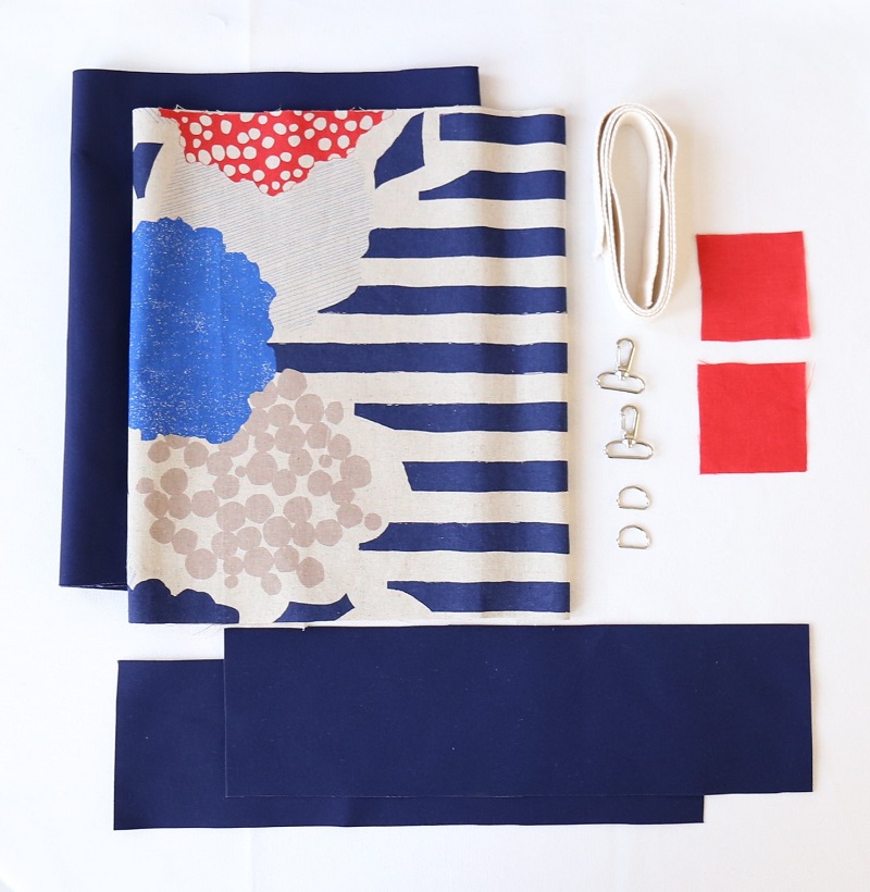 表布用、裏布用、タブ用の生地を寸法どおり裁ちます。バッグテープ、Dカン、ナスカンを用意します。