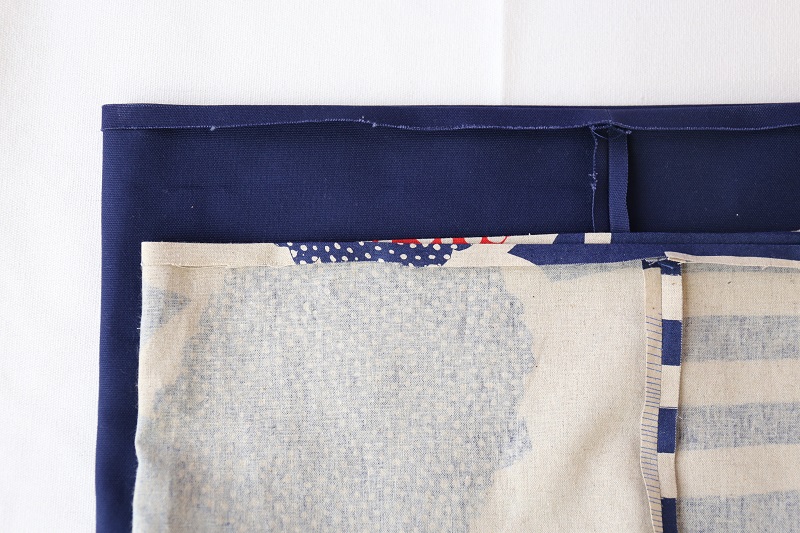 表袋を表に返し、裏袋と外表に重ね合わせ、両脇にタブをはさみ、口辺にバッグテープを挟みます。
