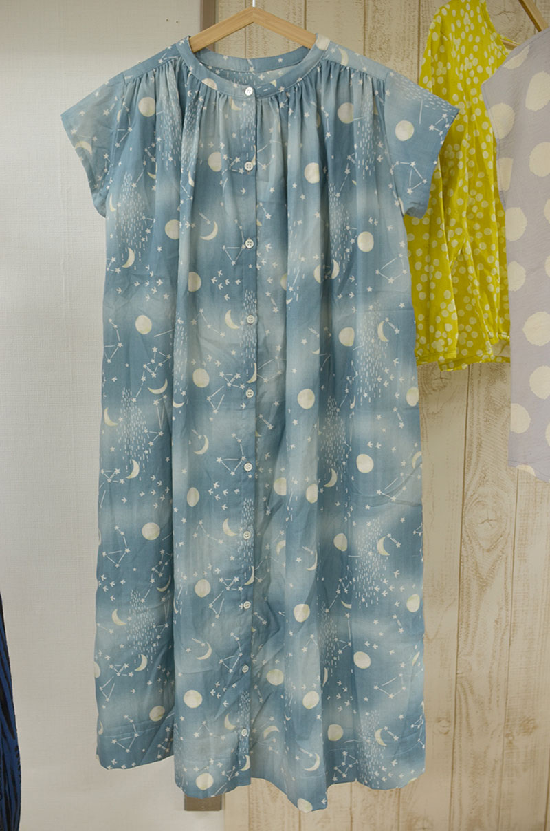 大人でも着てみたくなるダブルガーゼ、「トレフルクチート」で作ったワンピースです。肩にたっぷりギャザーを寄せて、ふんわりと仕上げました。着心地がいいので、お部屋でのリラックスタイムに手放せなくなりそうですね。