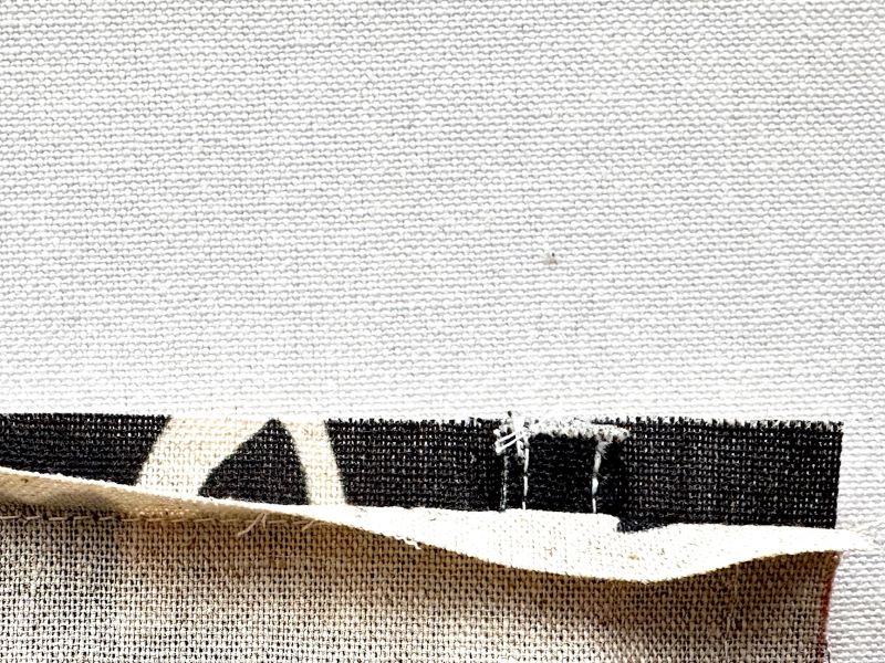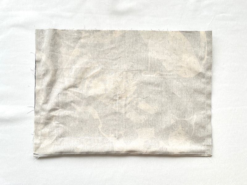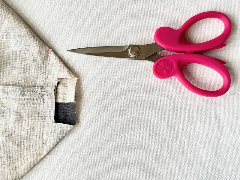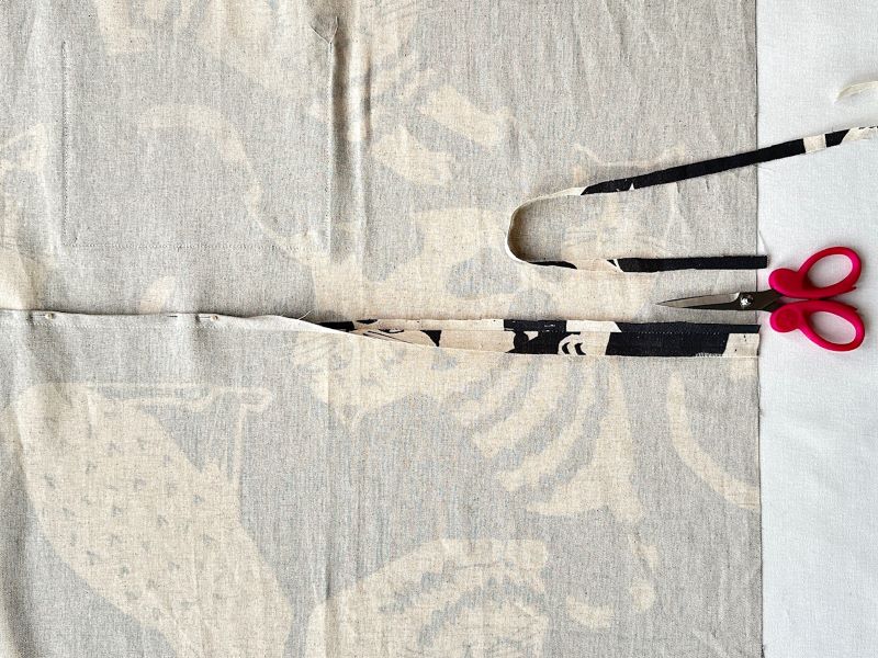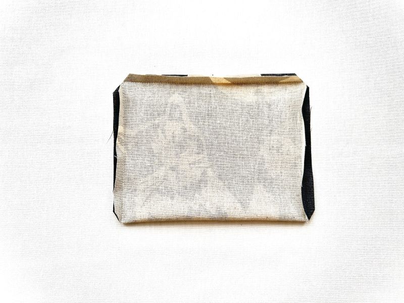 ポケット布を中表に二つ折りし、タブを挟み、返し口を残して縫います。角の縫い代をカットして表に返します。