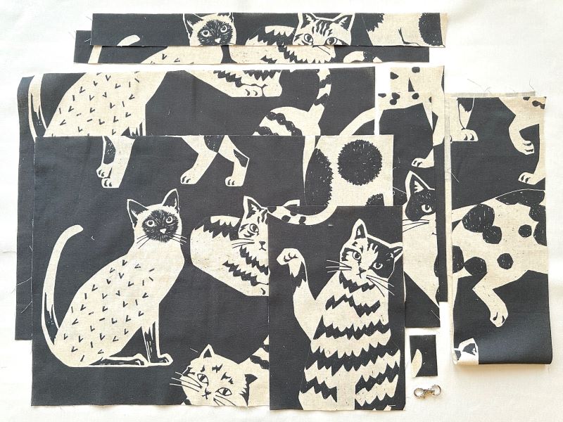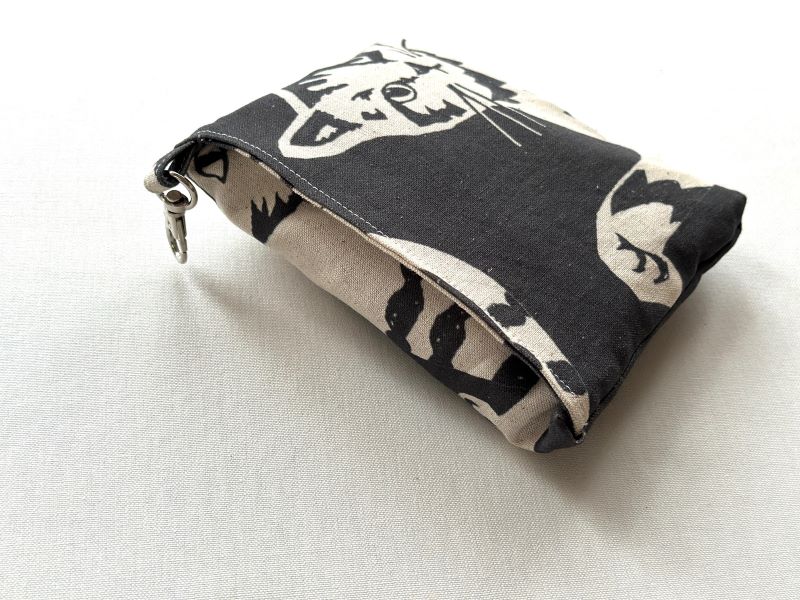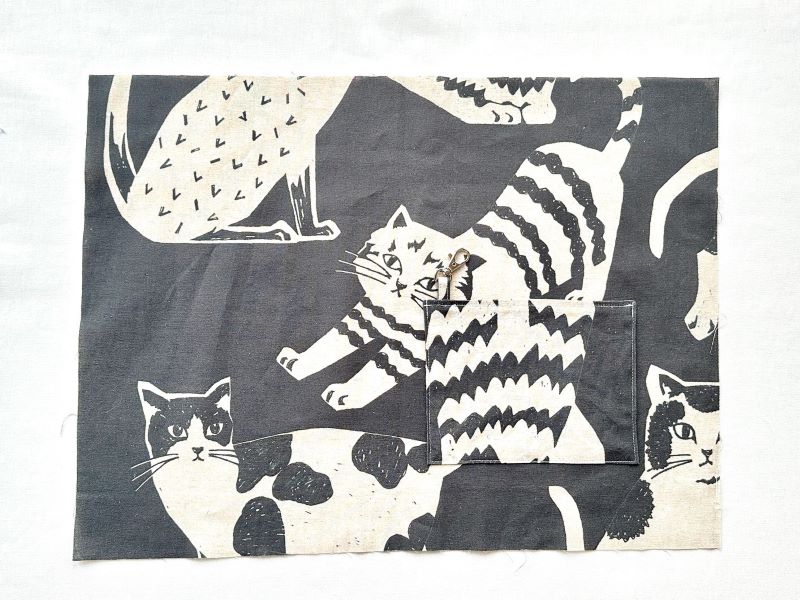 コンパクトに持ち歩ける大きめサブバッグです。1枚仕立てのバッグは折り畳んでポケットにすっぽり入ります。使った布は、Nekonoe kokka x echino。大柄なネコ柄がインパクト大! ほどよい厚さの綿麻キャンバスなのでバッグづくりにおすすめです。
