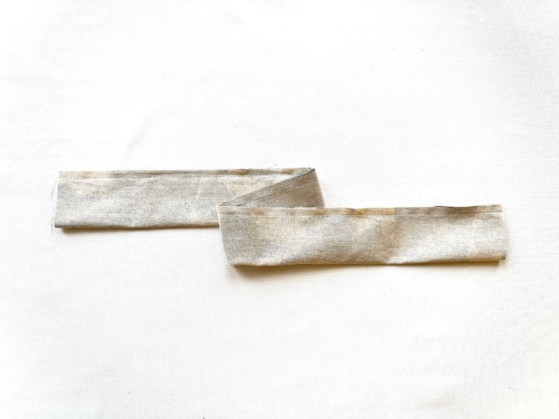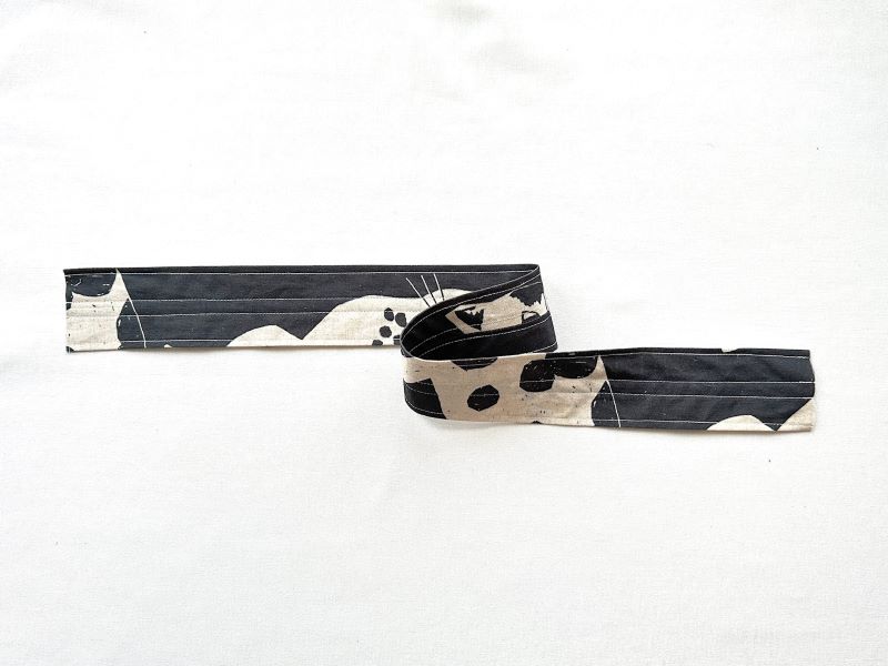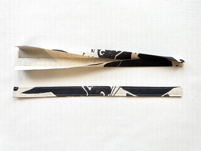 肩ひも布を中表で二つ折りにして縫い、表に返して縫い目を中央にずらしてステッチをかけます。