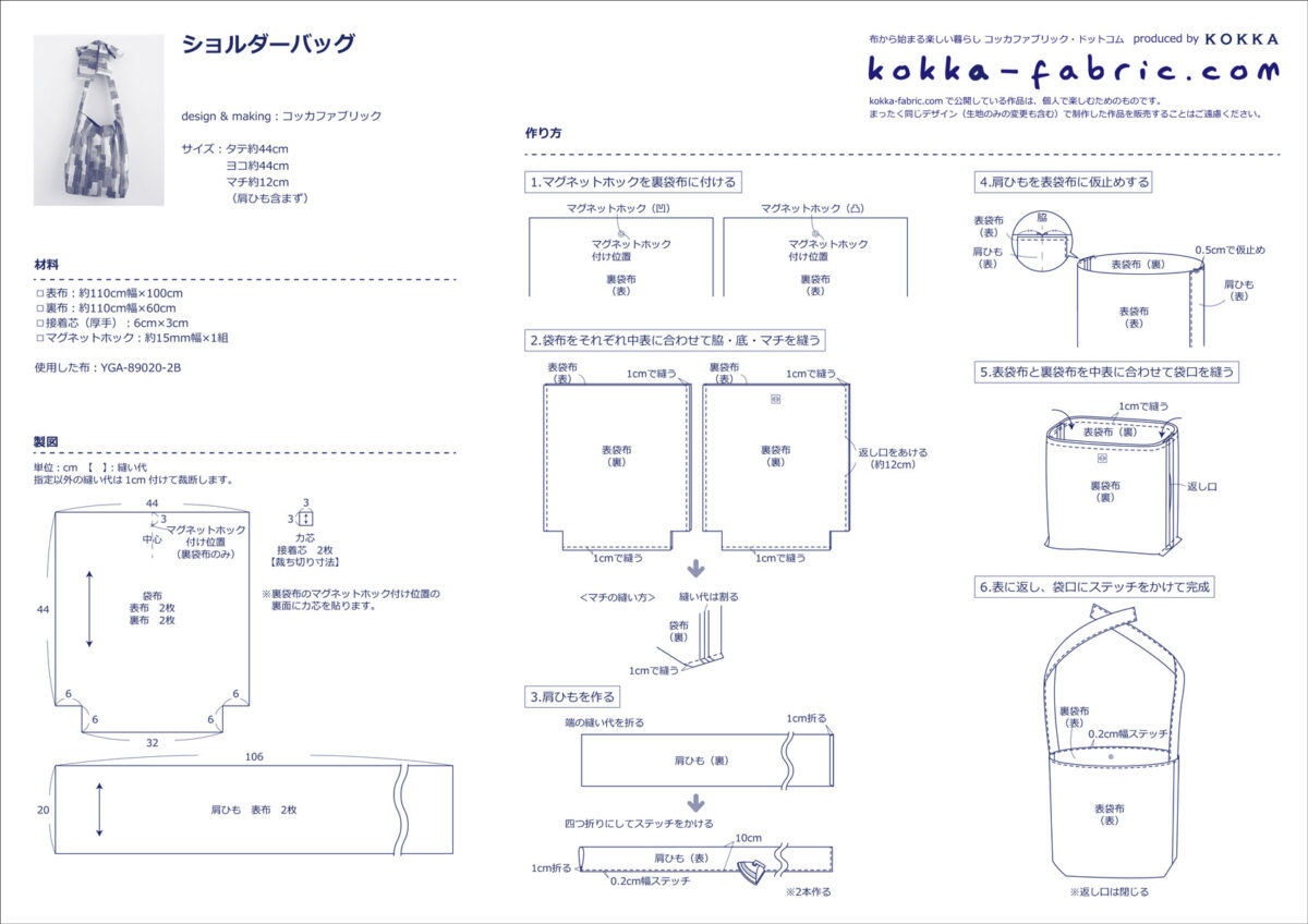 肩ひもを結ぶデザインのショルダーバッグです。使った布は、刺し子調デニムのパッチワーク風プリント。コットン100%のツイル生地は、ほどよい厚みと柔らかさがあり、バッグづくりにおすすめです。