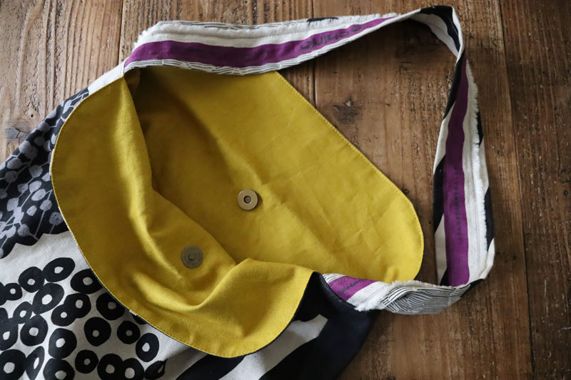 バッグの本体とフラップ(ふた)部分が一体となったショルダーバッグです。フラップを折り返すと、裏布の黄色が見えるデザインが新鮮♪ 使った布はechinoのリネンキャンバスシリーズ、[glee]。大きな花柄は、切り取る場所によって見え方が変わるのが魅力。裏布に使ったイエローの無地もechino。どちらもほどよい厚みのある綿麻キャンバスなので、バッグづくりにおすすめです。