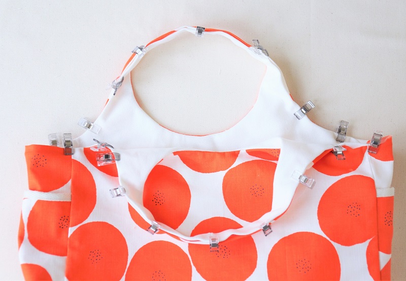 ハンドルを縫うところが、このバッグ作りの山場だと思います。カーブ部分は、縫い代にしっかり切り込みを入れましょう。きれいなカーブが出るように意識しながら仕上がり線に沿って折ってくと良いですよ。