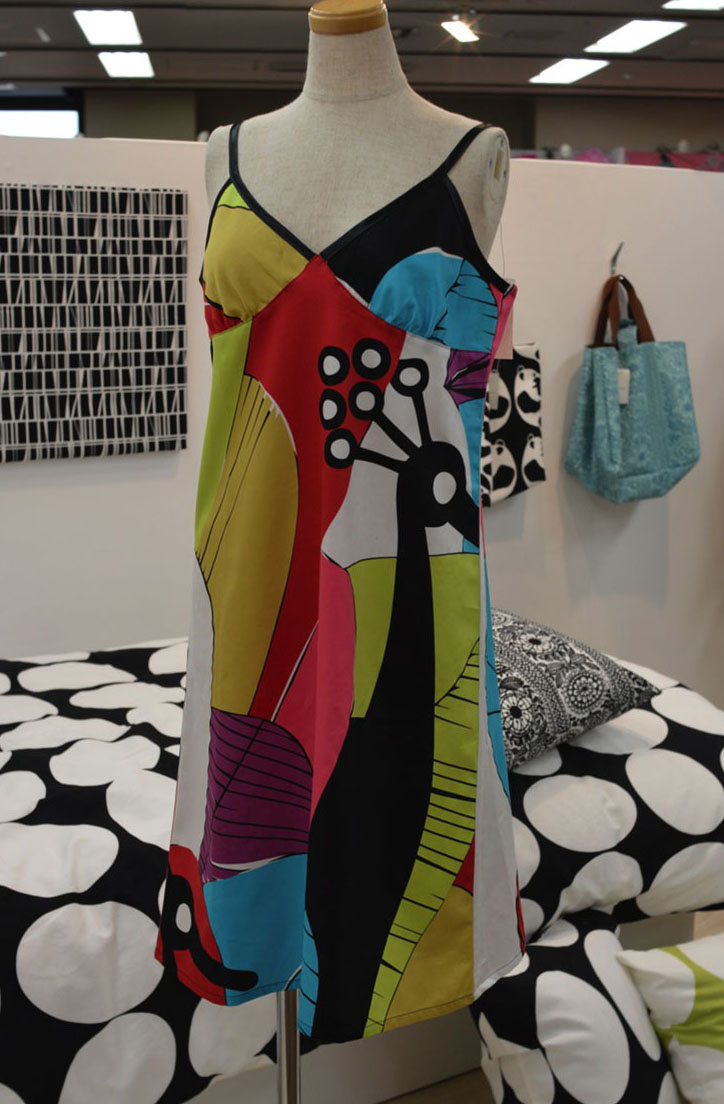 フィンランドの人気テキスタイル、フィンレイソンがcraft&sewing のコーナーに登場。ダイナミックな大柄、「KEISARI」(ケイサリ)でスリップドレスを作りました。この柄は、美しい光沢と滑らかな素材感が特徴のサテン生地。サラサラとしていて、シルクのような肌触りなので、素肌にそのまま身につけるスリップドレスにぴったりです。