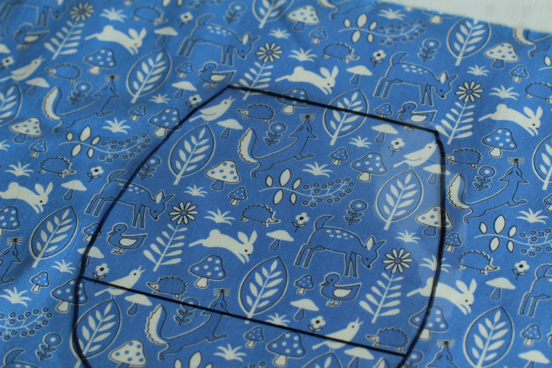 柄のどの部分を切り取るかはとても重要なポイントです。透明の袋などに出来上がりの形をマジックで書いて布の上で動かすと、どのような構図にすればいいか探すのに便利です。この写真の場合は、左下のウサギをどこに持ってくるかで切り取る場所を考えました。