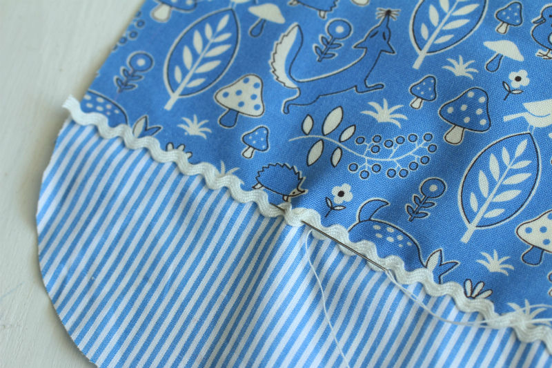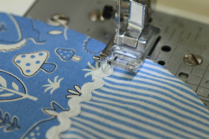 リックラックテープ(山道テープ)は布と布の境を隠すように縫いつけます。ちょっと面倒でもしつけをかけてから縫うようにしています。急がば回れ!です。