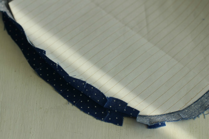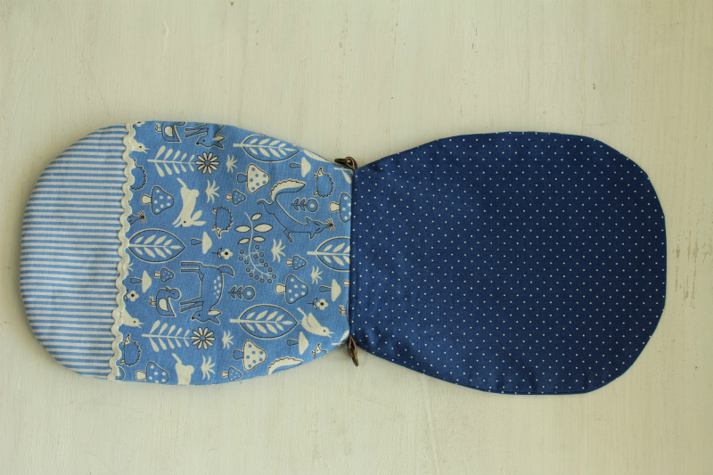 ぐるりと縫ったあと、この状態でしっかりアイロンをかけ、返し口を綴じ、表布を中布に入れて、押さえミシンを1周かけます。