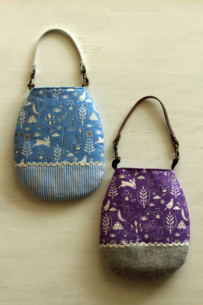 小物づくりに最適な小柄シリーズ「プチプリ」で作った、ティアドロップ形のスマホポーチです。使った布は、動物やきのこモチーフが北欧っぽい「プチウッド」。ブルーの布は「夏」、パープルは「冬」のイメージで2種類です。制作してくれたのは、おしゃれな柄合わせが評判の中山佳苗さん。柄合わせにこだわりたい人必見の、見せたい柄を上手に切り取る方法、“中山さん流・柄見せのコツ”もぜひチェックして!