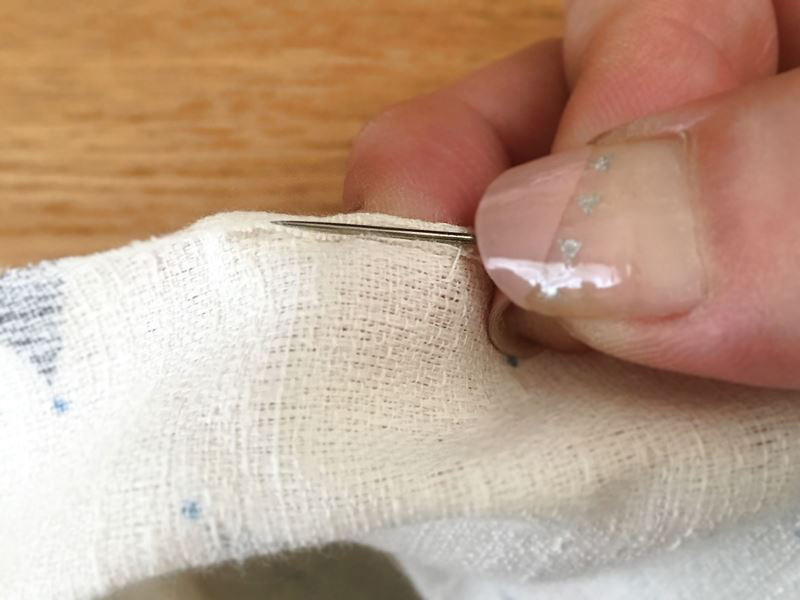 こちらでは布の端に糸をぐるぐる巻いていく方法をとっていますが、まつり縫いやはしご縫い、縫い方はお好みでよろしいかと思います。また、あえて目立つ色の糸を使っても面白いですね。
