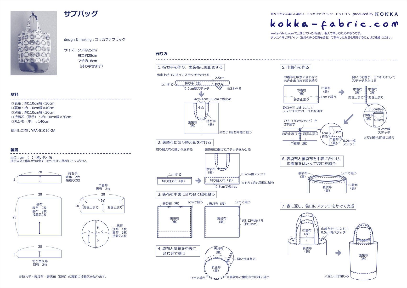 内側が巾着になったサブバッグです。直径18cmの丸底なので、ランチボックスも平らなまま入ります。使った布は「ANIMAL BREAD」シリーズ。パンの上に愛らしい動物たちが乗っています。コットン100%のオックスフォードなので縫いやすく、ソーイング初心者さんにもおすすめです。