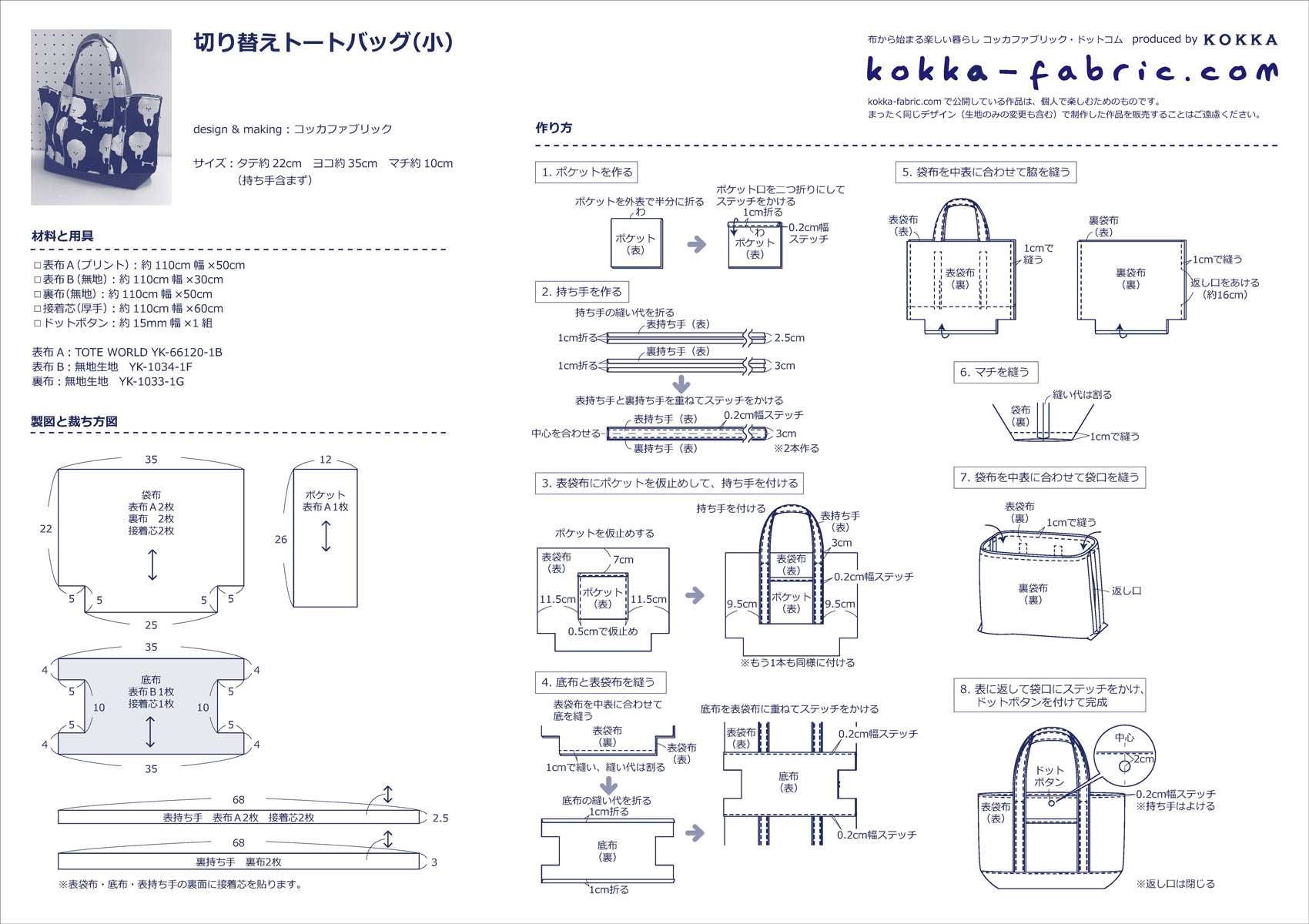 ボディと底布が切り替えになったトートバッグです。便利な外ポケットつきデザインなのもうれしい。使った布はTOTE WORLDシリーズの可愛いドッグ柄、バッグ作りにぴったりのオックスフォード地です。方向のある生地なので裁つときは柄が逆さまにならないように注意して。