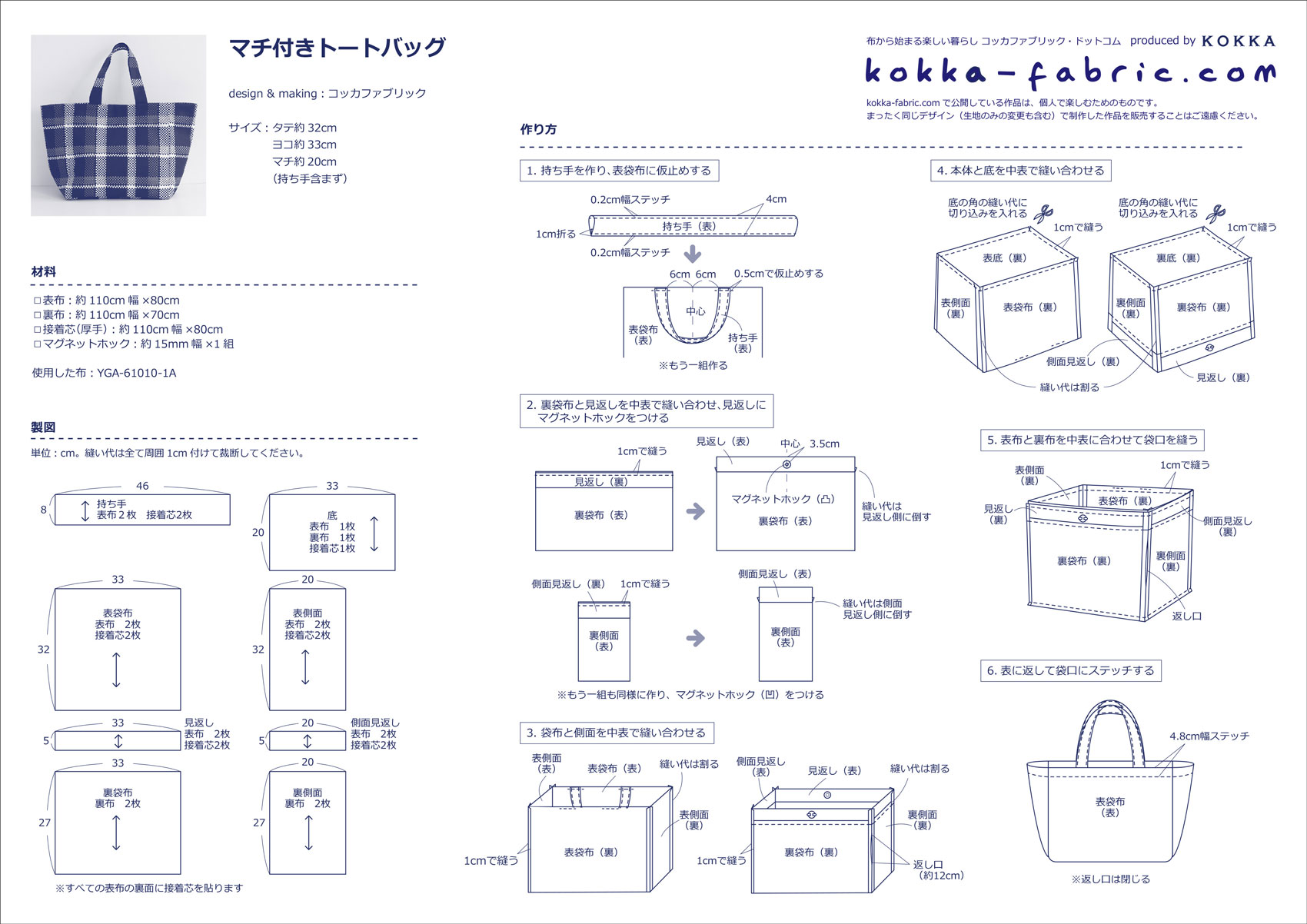 お買い物に便利なたっぷりマチのトートバッグです。20cmのマチはお弁当やお惣菜も平らにして持ち運べる便利なサイズ。入れ口にマグネットホックをつけて中身をしっかりカバーできる仕様です。使った布は「Checks&Borders」シリーズ。トラディショナルなチェック柄はデイリーな定番バッグとして重宝します。生地は、ソーイングが初めての方でも縫いやすいコットン100%のオックスフォードです。