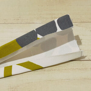 持ち手を作ります。持ち手布(10×40cm)を1cmずつ内側に折り、さらに半分に折った状態。