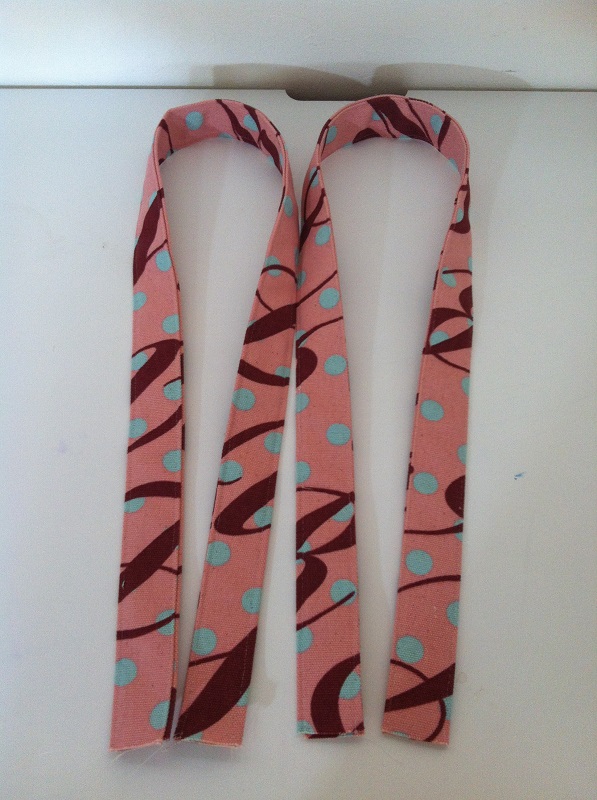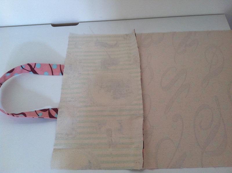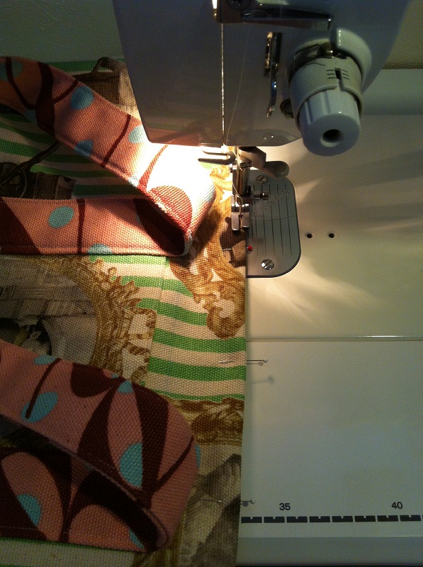 1. 持ち手を縫い合わせた線に重ねるようにして、持ち手を本体に縫い付ける。