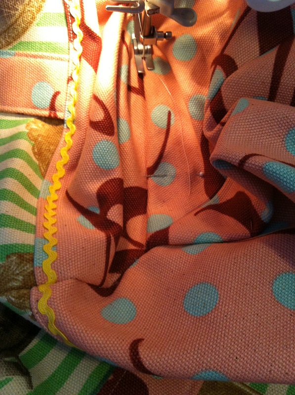1. 本体と内袋を中表に合わせ、持ち手を縫いこまないように注意して一周ぐるりと縫い合わせる。