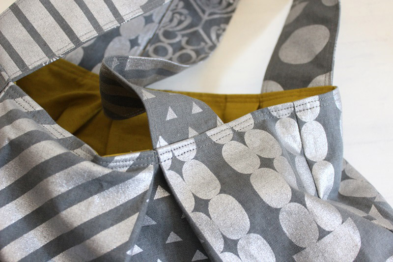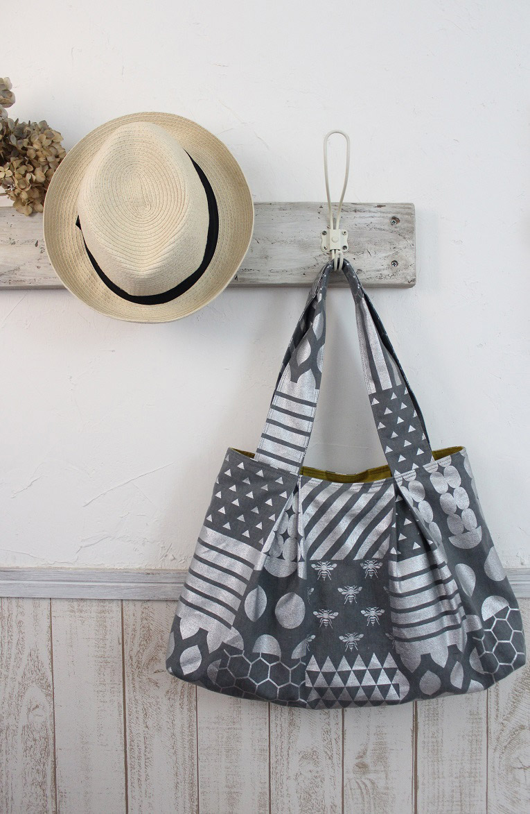 echinoのシルバーメタリック柄、幾何モチーフをつないだ「piece」を使ったトートバッグです。作ってくれたのはハンドメイド作家で人気ブロガーのneige+こと、猪俣友紀さん。ピース(ブロック)に合わせて裁断すれば、サイズを測らなくてOKという簡単仕立てです。入れ口のタックもピースを目安にしています。表布はすべてシルバーメタリックでシックに仕上げ、内側にマスタードイエローを合わせて、ちらりとのぞくときのポイントに。「チャコールグレイは、どんな色味とも相性がいいので、ピンクやブルーといったちょっと明るめの色を合わせてもいいですね」(猪俣さん)