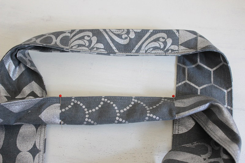持ち手を10cmほどたたんで四角に縫い合わせて肩にかかる部分を細く仕上げます。