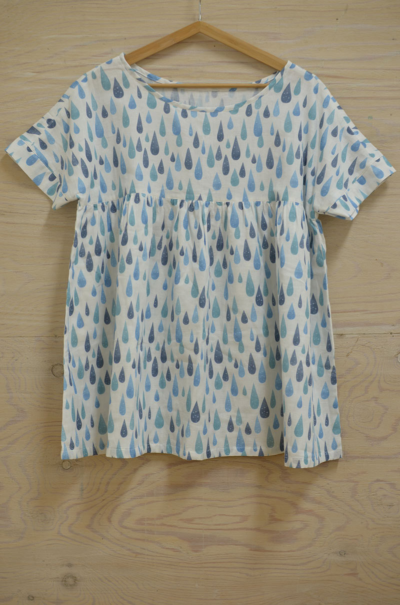 大人も着られるダブルガーゼ、碧シリーズの「しずく」を使ったチュニックトップです。上身頃と下身頃をハイウエストで切り替え、可愛らしい雰囲気に仕上げました。