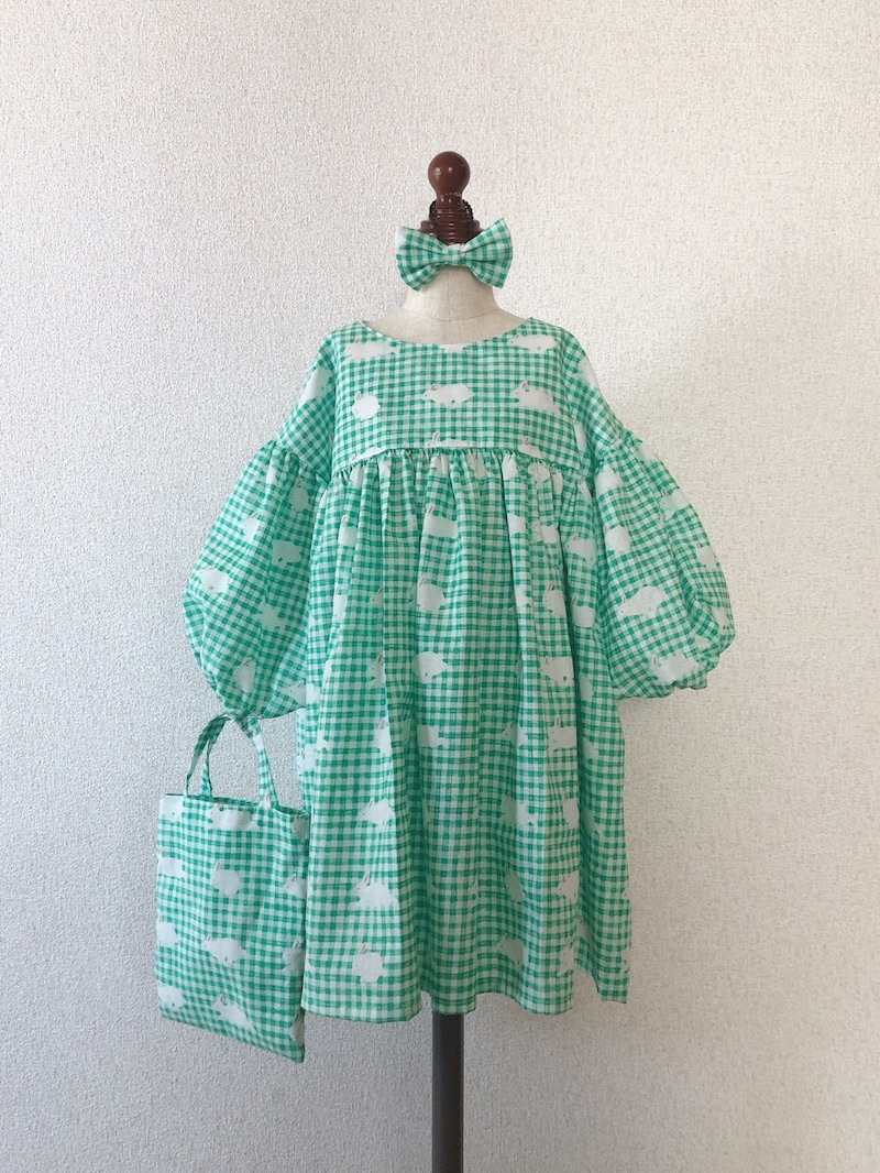 ヨーク仕立てでスカートにギャザーをたっぷり寄せたキッズワンピースです。袖もボリュームを出して可愛らしく仕上げました。使った布は「動物ぽんぽん」でおなじみの作家、trikotriさん描きおろしのテキスタイルブランド、kotrinunoのUsa Ginghamです。
