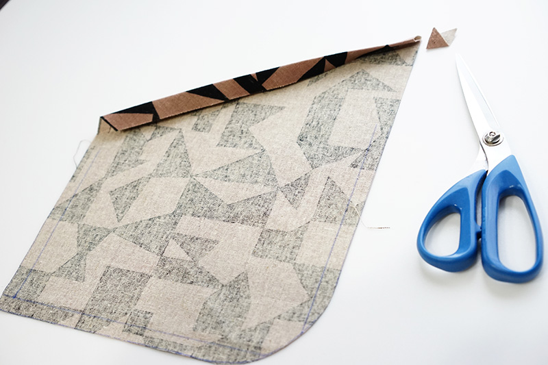 ポケットの入れ口側を三つ折りにし、ステッチします。はみ出した縫い代はカットします。