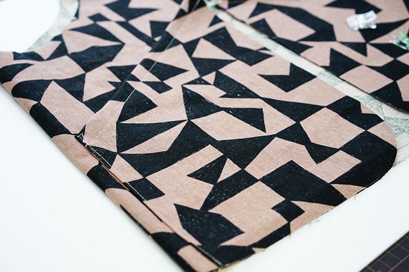 ポケットの短い辺にロック(ジグザグ)ミシンをかけ、縫い代を1cm裏側に折り、本体に縫いつけます。